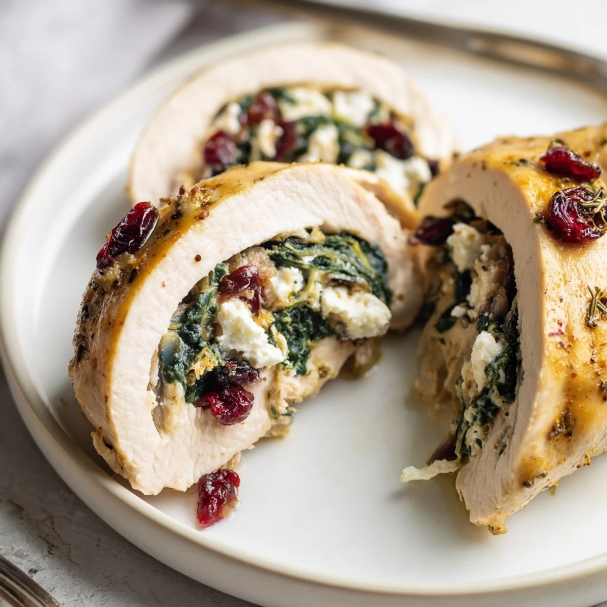 Ready in about 50 minutes (20 minutes prep, 30 minutes cook) and yields 4 servings. Sauté garlic and fresh spinach until wilted, then fold into softened cream cheese, crumbled feta and chopped dried cranberries to form the filling. Cut a pocket in each boneless chicken breast, stuff evenly, secure if needed, brush with olive oil and season with paprika and thyme. Bake 25–30 minutes until juices run clear and internal temperature reaches 165°F; rest 5 minutes before slicing. Optional additions include chopped toasted walnuts for crunch; serve with wild rice or roasted vegetables for a complete plate.