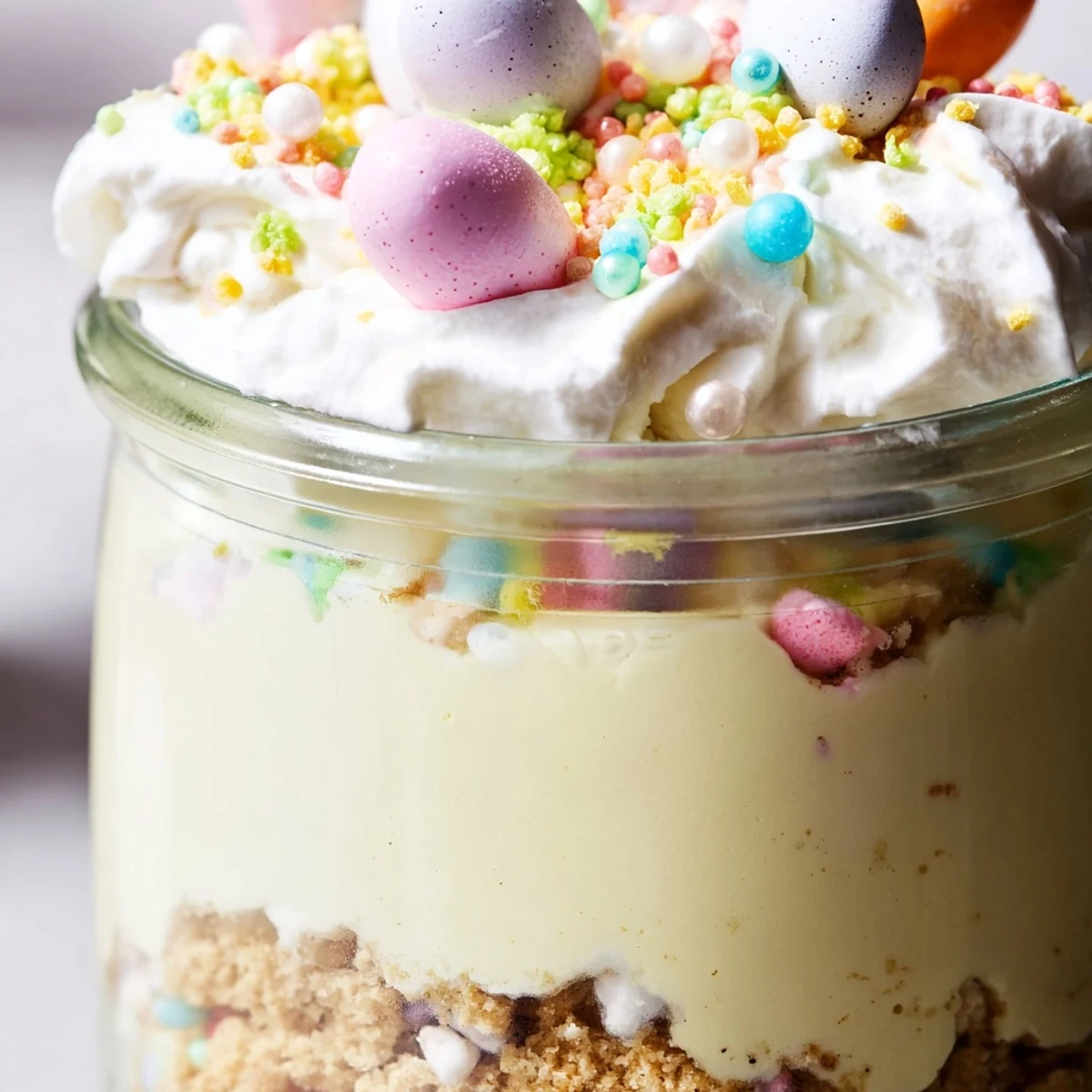- Top each chilled jar with a swirl of whipped cream, a few extra Easter eggs, and a generous sprinkle of rainbow confetti before serving