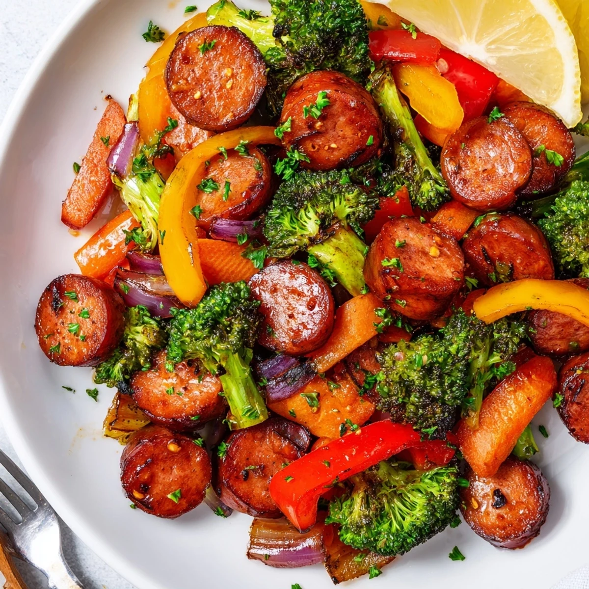 This vibrant sheet pan dinner features smoked kielbasa sausage paired with colorful broccoli, bell peppers, carrots, and red onion. Everything gets coated in a balanced honey garlic glaze with hints of Dijon mustard and smoked paprika, then roasted until caramelized and tender.