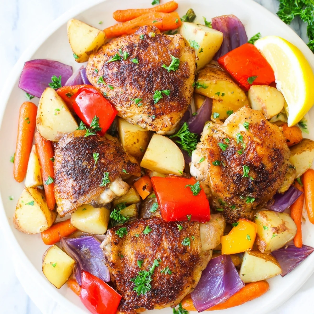 This roasted chicken and vegetable dish combines juicy bone-in thighs with baby carrots, bell peppers, onions, and Yukon Gold potatoes. Coated in a blend of olive oil, Italian herbs, garlic, and smoked paprika, everything is roasted together for a flavorful dinner that requires minimal cleanup. The chicken skin crisps up beautifully while the vegetables become tender and infused with savory seasoning. Garnish with fresh parsley and lemon wedges to brighten the plate. Perfect for easy weeknight dinners or family meals.