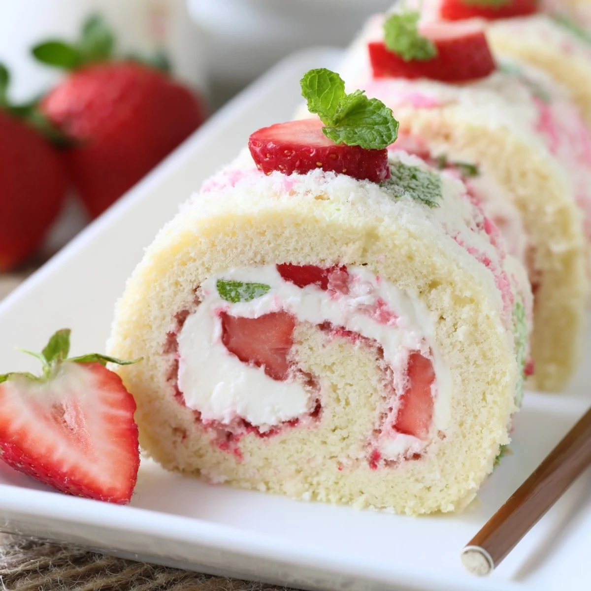 Transform traditional strawberry shortcake into an eye-catching dessert that resembles sushi rolls. Soft vanilla sponge cake gets rolled with sweetened whipped cream and fresh diced strawberries, then sliced into bite-sized pieces topped with strawberry slices and optional mint.